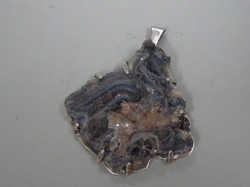 Hanger Chalcedoon Druzy in zilver Spectaculaire steen in oorspronkelijke vorm. Momenteel in vitrine LOC Hardenberg. Afmeting: 50 x 50 mm Prijs: € 93 Collectienummer 2551